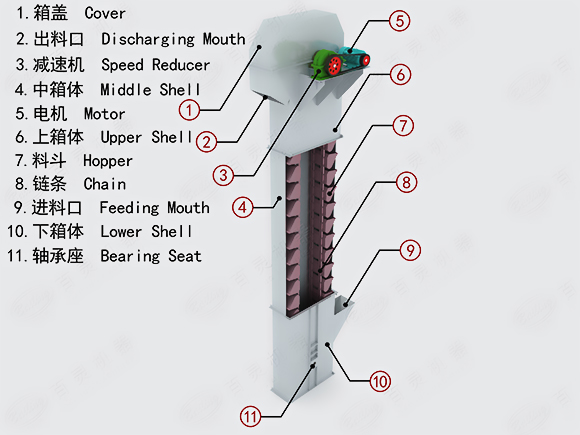 斗式提升機(jī)是利用均勻固接于無端牽引構(gòu)件上的一系列料斗,豎向提升物料的連續(xù)輸送機(jī)械。分為環(huán)鏈、板鏈和皮帶三種。